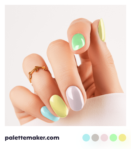 A tetradic color palette with Nude Pink, light grayish magenta, light grayish lime green, and light grayish cyan can create a gentle and mellow feel in a design.